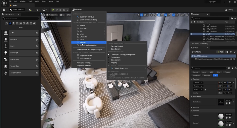좋아요, 이것이 우리 Visual Studio의 모습일 것입니다. 모든 것을 닫고, 언리얼 엔진 뷰포트로 돌아가서, ‘플랫폼’아래 **‘윈도우’**로 가서 **‘패키지’**를 클릭합니다. 좋아요, 경로를 만들고 **‘폴더 선택’**을 클릭하고 패키지를 만들 수 있습니다.
