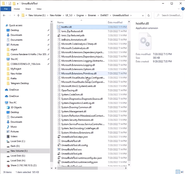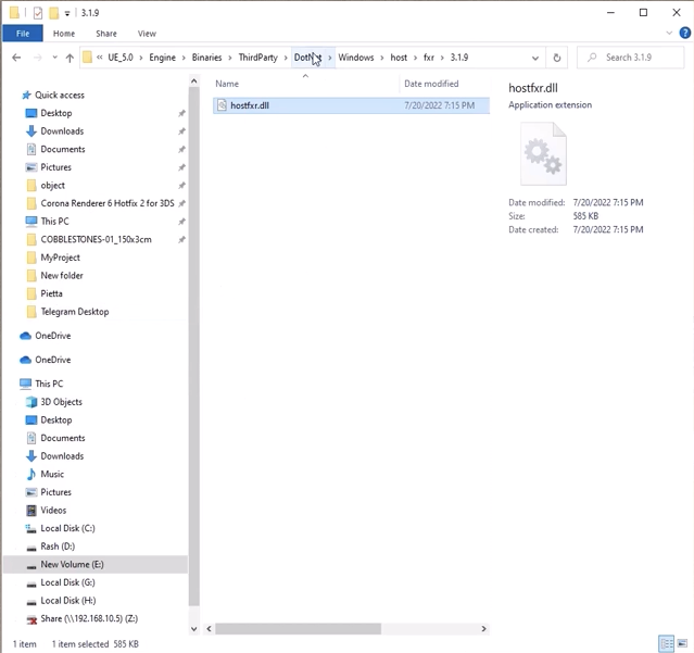 이 새 폴더 안에는 다른 버전들이 있습니다. 지금 우리는 버전 5, 즉 UE 5를 다루고 있습니다. 그리고 ‘Engine’으로 갑니다. 그런 다음 ‘Binaries’로 갑니다. 이 폴더에서 ‘Binaries’로 가세요. ‘Binaries’ 안에서 ‘ThirdParty’로 가세요. 그리고 그 안에서 ‘.NET’으로 가세요. 그런 다음 ‘Windows’로 가고, ‘Host’로 가세요. 그리고 그 안에 이 두 폴더가 있습니다. 이 파일을 찾을 때까지 복사하세요.