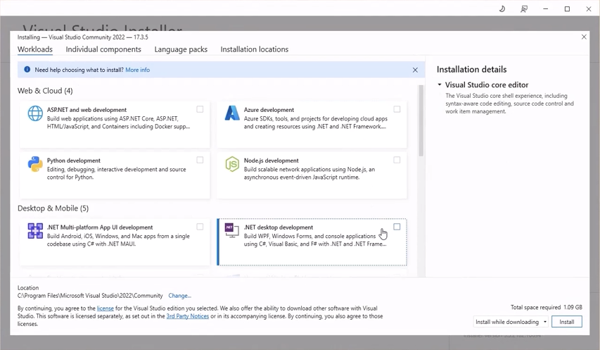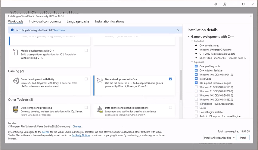 **‘.NET 데스크톱 개발’(.Net Desktop Development)**을 선택하고 체크하세요. 그리고 **‘C++를 사용한 데스크톱 개발’(Desktop Development with C++)**도 선택합니다. 이들은 절대적으로 필요한 파일입니다. **‘C++를 사용한 게임 개발’(Game Development with C++)**도요.