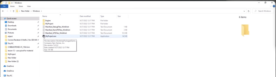 자, 우리 폴더로 가서 실행 파일이 우리에게 무엇을 주는지 봅시다. **‘Windows’**라는 폴더 안에 있습니다. 그리고 여기 언리얼 엔진 아이콘이 있는 이 .exe 파일이 고객이 실행하게 될 것입니다. 아이콘도 수정할 수 있습니다. 몇 개의 파일과 폴더도 있습니다.