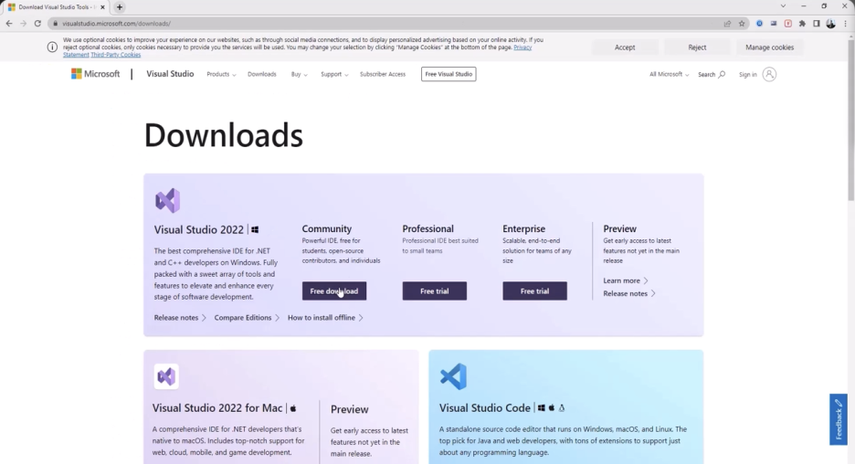 자, 필요한 파일을 실제로 다운로드합시다. 구글로 가서 **‘Visual Studio 다운로드’**를 검색합니다. 우리가 얻는 광고 결과는 무시하고, 원본인 **Microsoft(마이크로소프트)**에서 Visual Studio를 다운로드하려고 노력하세요. 이것이 우리가 찾고 있는 것입니다. ‘커뮤니티’(Community) 아래에 있는 ‘무료 다운로드’(free download) 버튼을 클릭할 것입니다. 그리고 그냥 다운로드할 것입니다. 다른 웹사이트에서 이것을 다운로드할 수도 있지만, 저는 항상 학생들에게 모든 것을 실제 **주요 출처(main source)**에서 다운로드하라고 조언합니다.