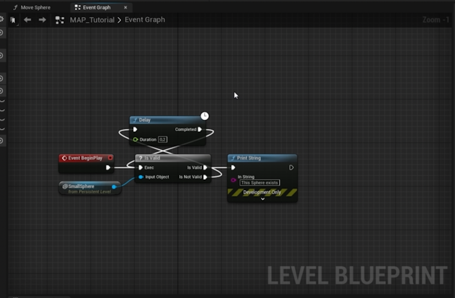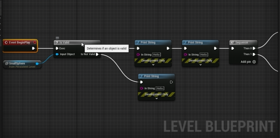 - Is Valid (유효함): 만약 구체가 레벨에 존재하고 생성되었다면, 'Is Valid' 핀에 연결된 코드를 실행합니다. (예: Print String으로 "This sphere exists. (이 구체가 존재합니다.)" 출력)