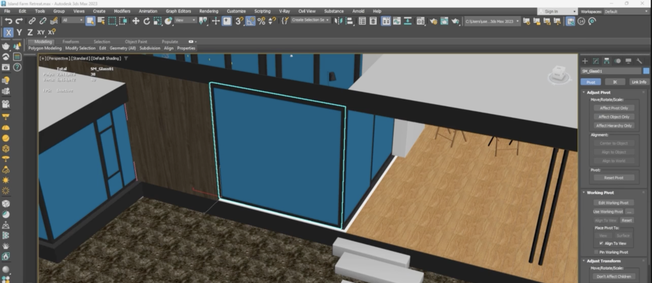 3D 모델링 수정: 3ds Max에서 창문과 문틀이 하나의 **스태틱 메시(Static Mesh)**로 결합되도록 수정합니다. 이 과정은 언리얼 엔진에서 두 개체가 함께 움직이도록 하기 위함입니다. 수정 후 **피봇 지점(pivot point)**을 문의 시작점에 맞춰 FBX 파일로 내보냅니다.