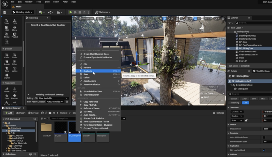 • 블루프린트 복제(Duplicate): 이미 만든 BP_SlidingDoor를 복제하여 새로운 슬라이딩 도어를 만듭니다. 이렇게 하면 원래 블루프린트의 로직은 유지한 채로 새로운 문을 만들 수 있습니다.
