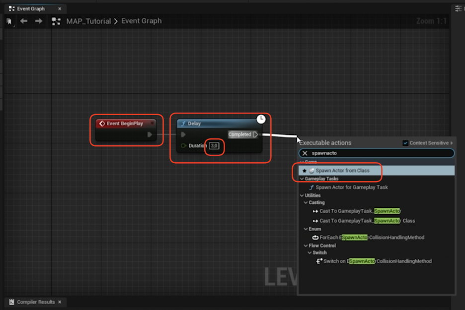 - 지연 노드 뒤에 Spawn Actor from Class 노드를 추가합니다.