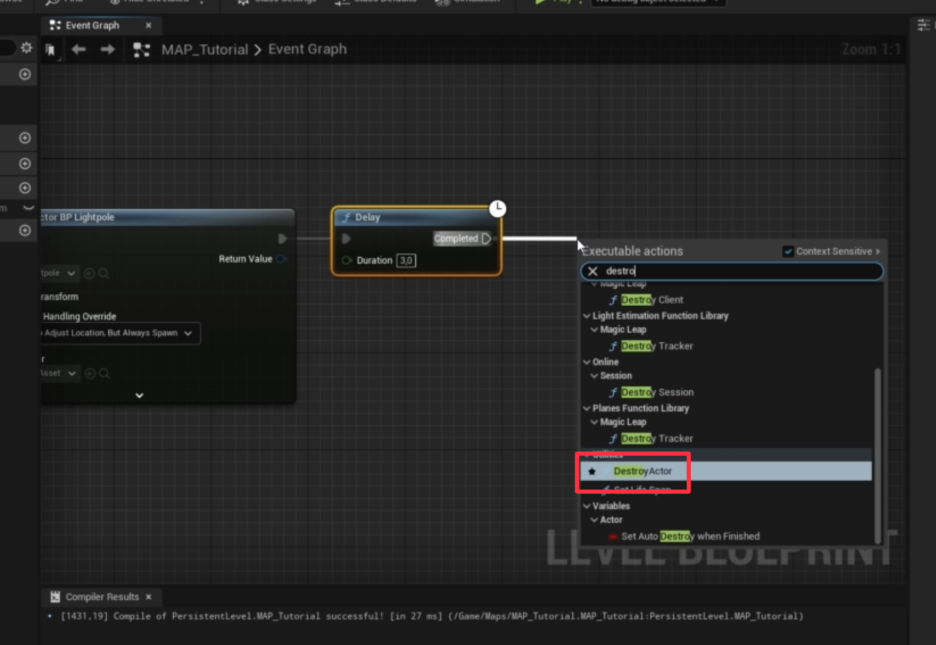 - 파괴 대상 (Target) 지정: Destroy Actor 노드는 어떤 액터를 파괴할지 지정하는 Target (대상) 입력 핀이 필요합니다. 우리는 방금 생성한 라이트 폴을 파괴해야 합니다.