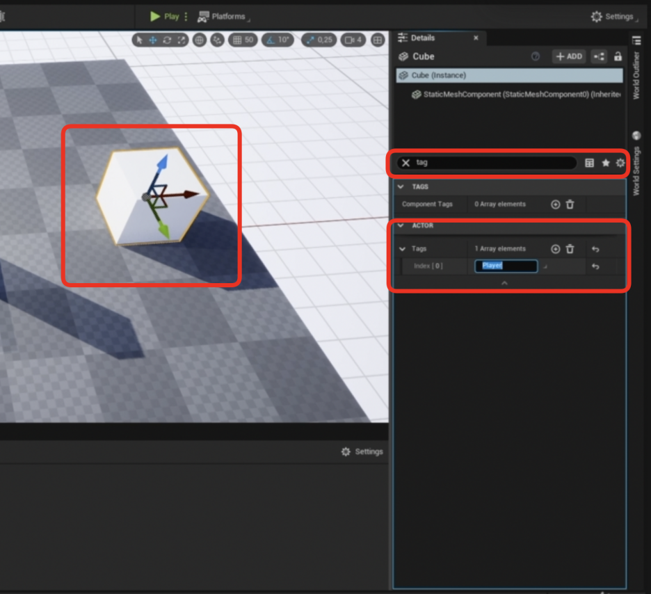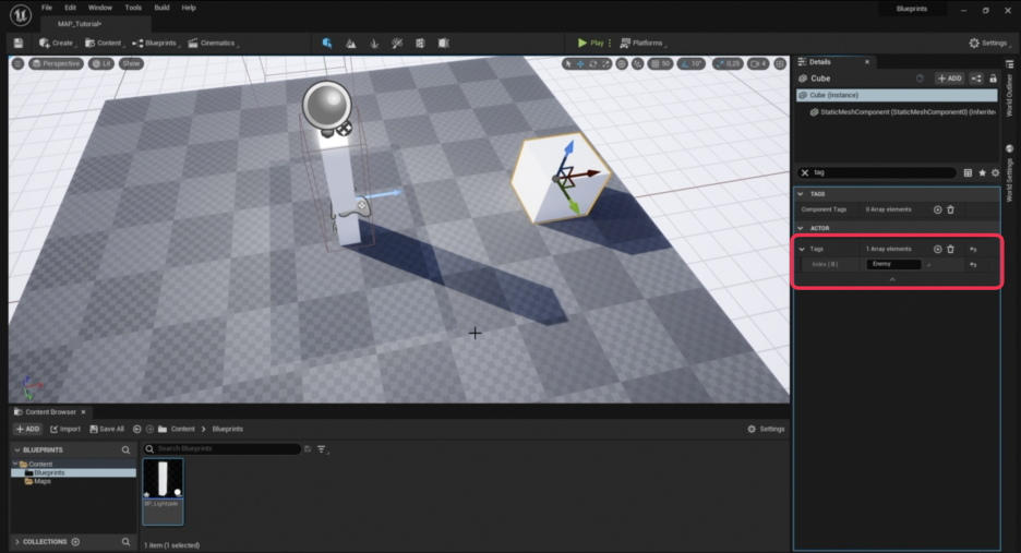 이제 우리가 제어하는 액터(테스트용 큐브)에 실제로 이 태그를 부여해야 합니다.