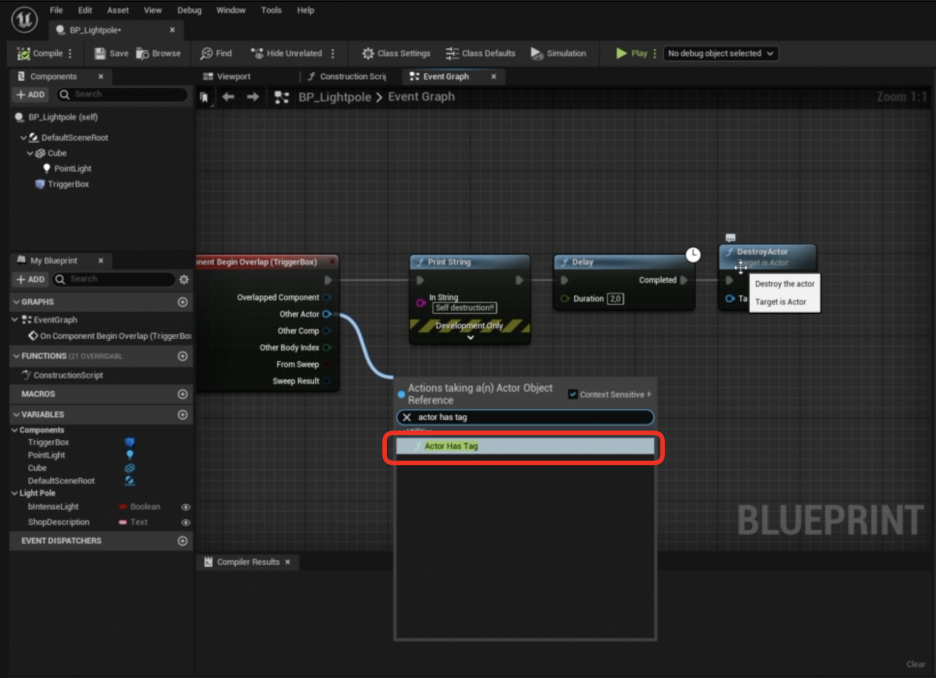 이전 강의에서 만든 BP_LightPoleTrigger Box는 어떤 액터든 겹치면 Begin Overlap 이벤트를 실행하고 액터를 파괴합니다.