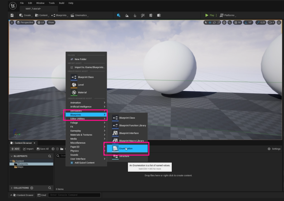 - 콘텐츠 폴더에서 오른쪽 클릭 → 블루프린트(Blueprints) → **열거형(Enumeration)**을 선택합니다.