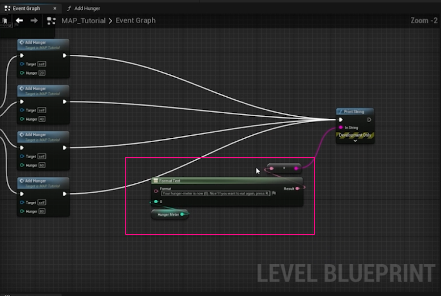- 포맷의 {HungerMeter} 핀에 Get HungerMeter 노드를 연결합니다.