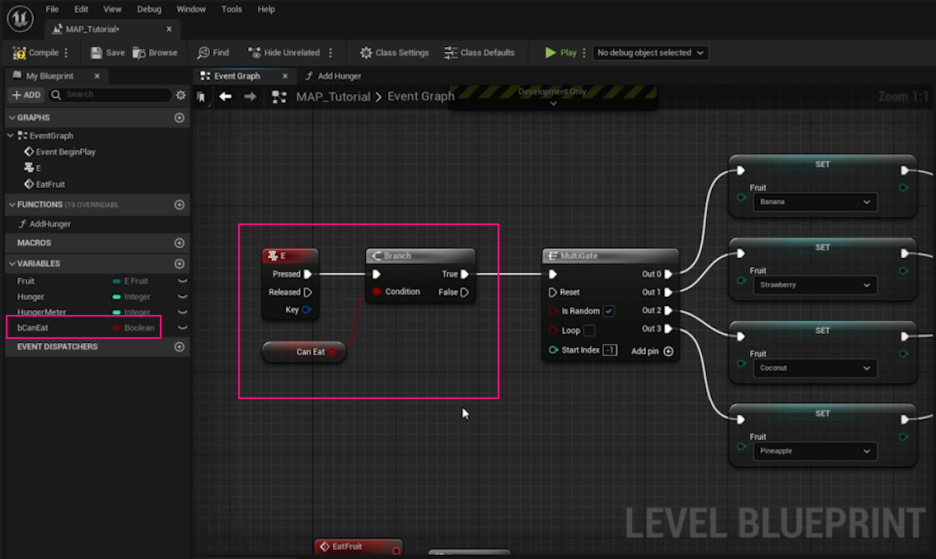 - E 키 이벤트 앞에 Branch 노드를 연결하고, CanEat 변수를 조건으로 연결합니다.