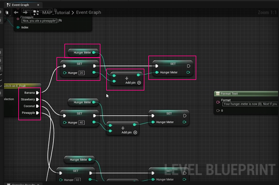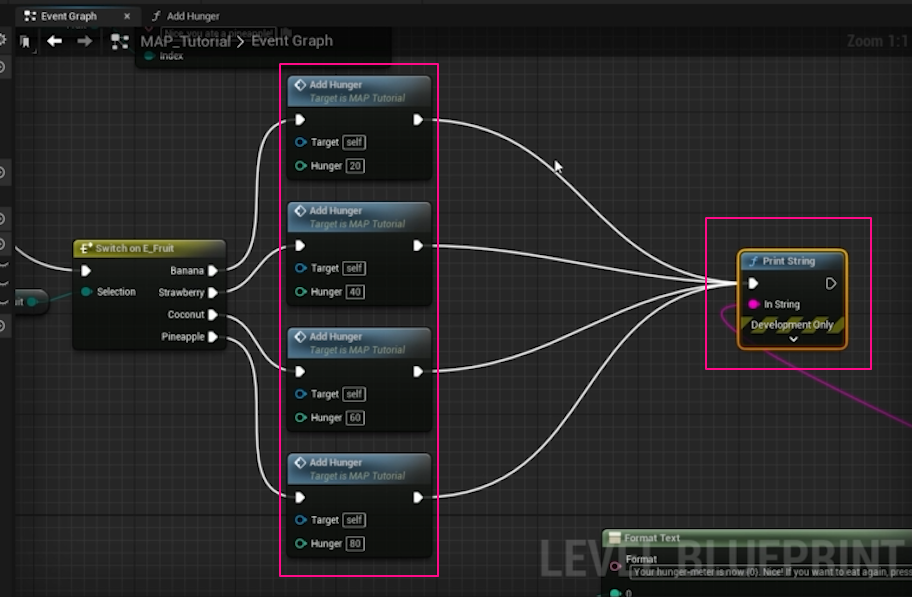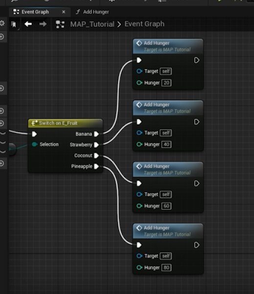 - Switch on E_Fruits의 각 핀에서 Set Hunger 노드로 연결하고, 각 과일에 따른 점수를 다르게 설정합니다. (예시: Banana 20, Strawberry 40, Coconut 80, Pineapple 5)