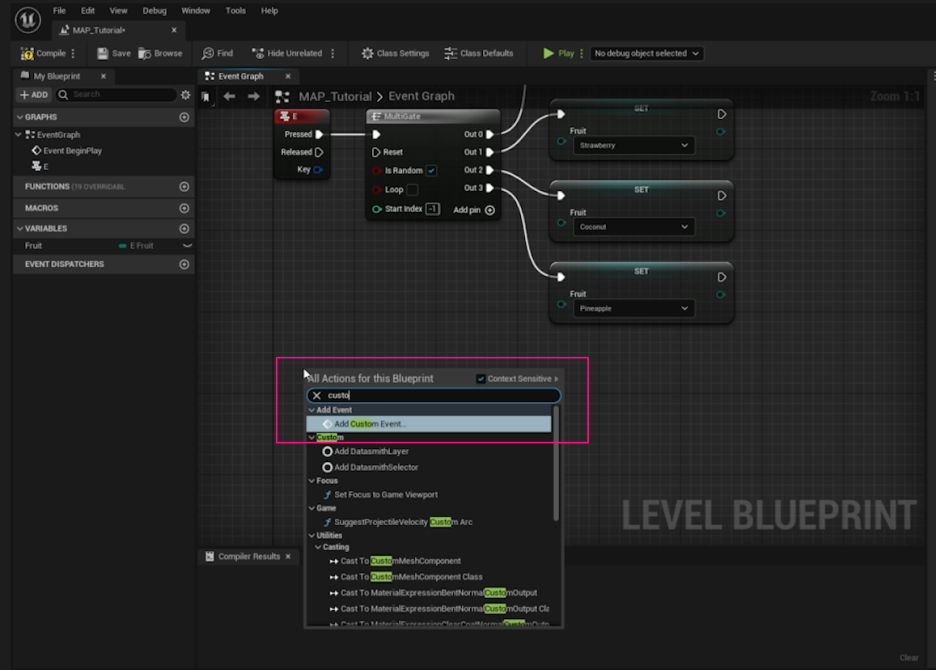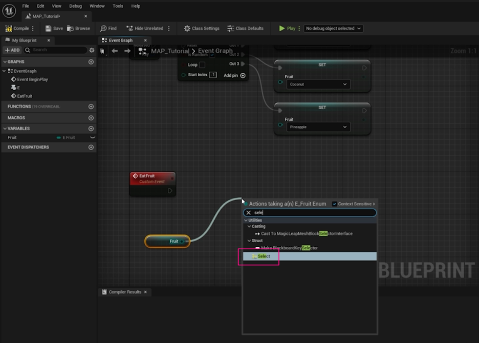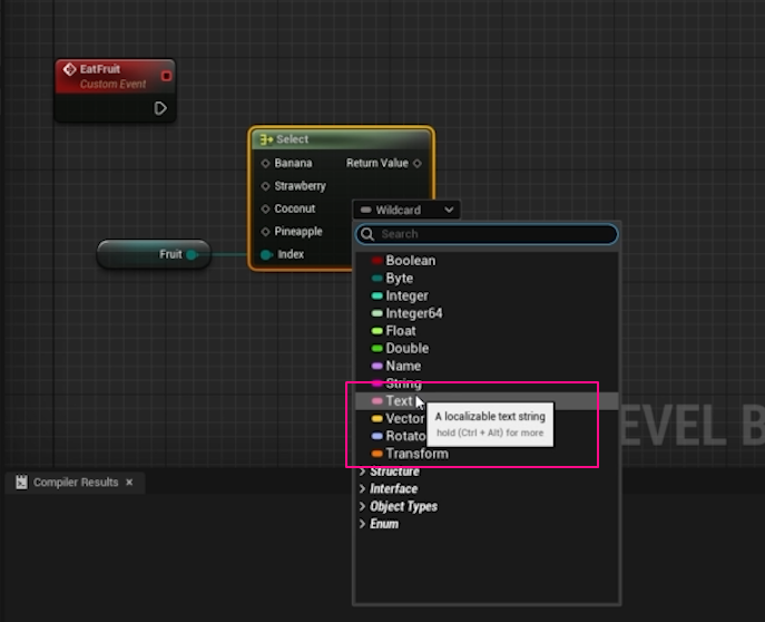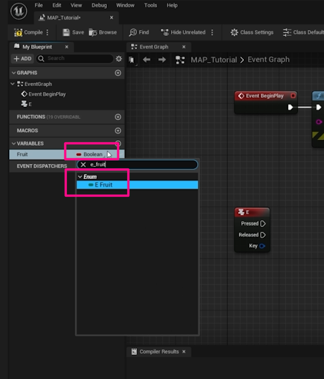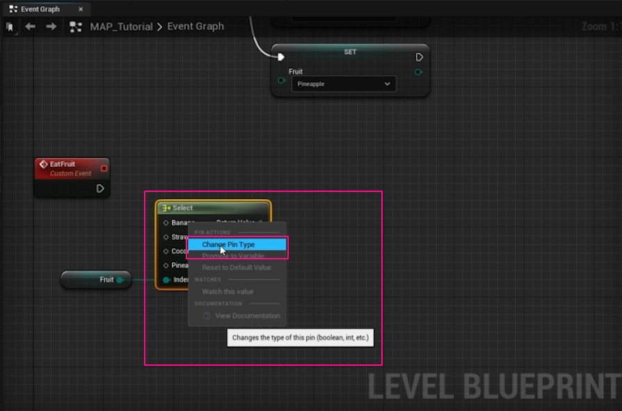 - 레벨 블루프린트에서 변수 이름은 Fruit으로, 타입은 E_Fruits로 설정합니다.
