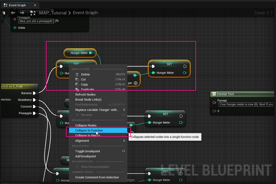 - (참고: 이 코드가 복잡해지면 함수(Function)로 축소할 수 있습니다. Set HungerMeter와 관련된 로직을 드래그하고 오른쪽 클릭 → Collapse to Function을 선택한 뒤 이름을 AddHunger로 지정하면 코드가 깔끔해집니다.)