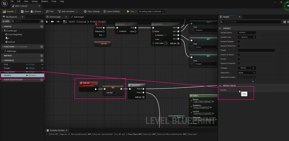 - EatFruit 이벤트가 시작될 때, Set CanEat 노드를 연결하고 값을 False로 설정합니다.