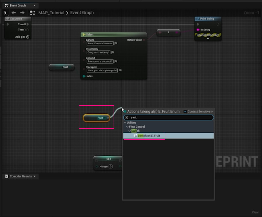 - Switch on E_Fruits 노드를 만듭니다. 이 노드를 EatFruit 이벤트의 실행 핀 바로 뒤에 연결합니다.