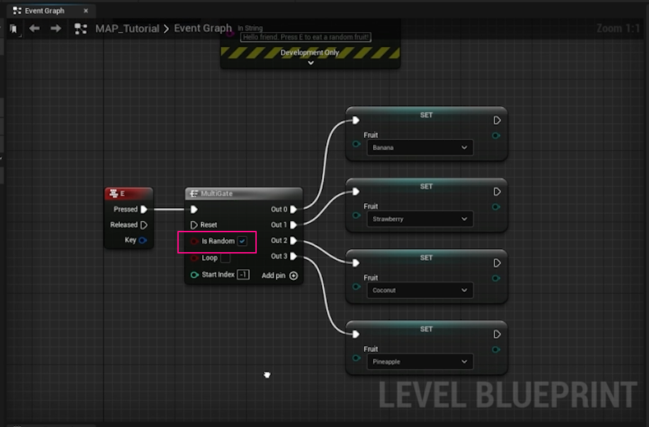 - 결과: E 키를 누르면 4개의 핀 중 하나가 무작위로 선택되어 Fruit 변수에 해당 과일 값이 설정됩니다.