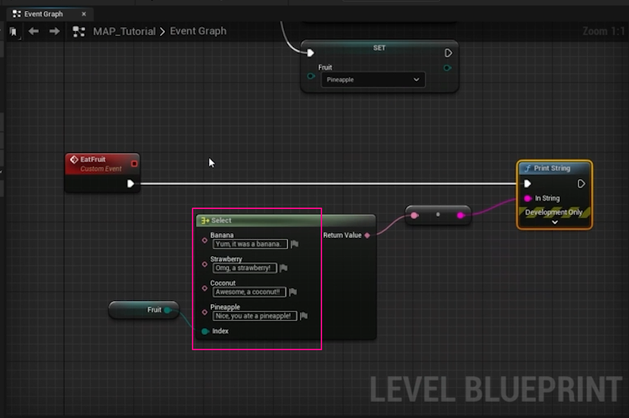 - 각 과일 값에 따라 출력될 텍스트를 입력합니다: | 열거형 값 | Select 출력 텍스트 (예시) | | :---: | :---: | | Banana | "Yum, it was a banana." | | Strawberry | "Oh my god, a strawberry!" | | Coconut | "Awesome, a coconut." | | Pineapple | "Nice, you ate a pineapple." |