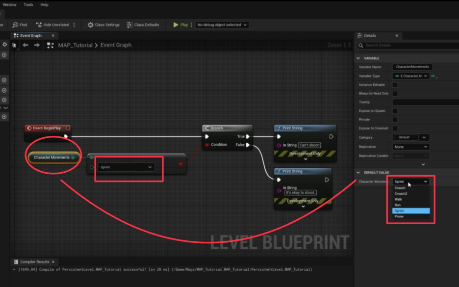 - 이전 시간에 만들었던 CharacterMovement 열거형 변수 (E_CharacterMovement 타입)를 이벤트 그래프로 드래그하여 Get 노드를 만듭니다.