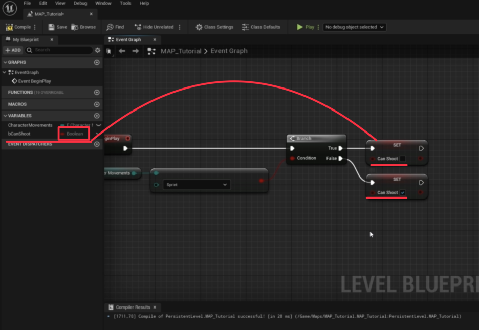 - 예를 들어, CanShoot이라는 불리언(Boolean) 변수를 만들고 값을 False로 설정합니다. (이제 플레이어는 사격할 수 없습니다.)