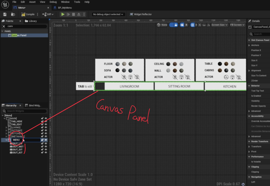- 올바른 정렬: 중요한 점은 Menu Bar 캔버스 자체를 이동하는 것이 아니라, 그 안에 있는 버튼들과 Tab Hide를 선택하여 왼쪽으로 이동시키고 높이 참조에 따라 고정시키는 것입니다. 이렇게 하면 모든 요소가 올바르게 그룹화되고 정렬됩니다.