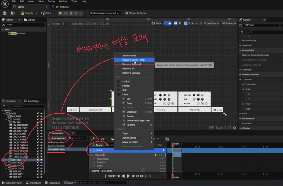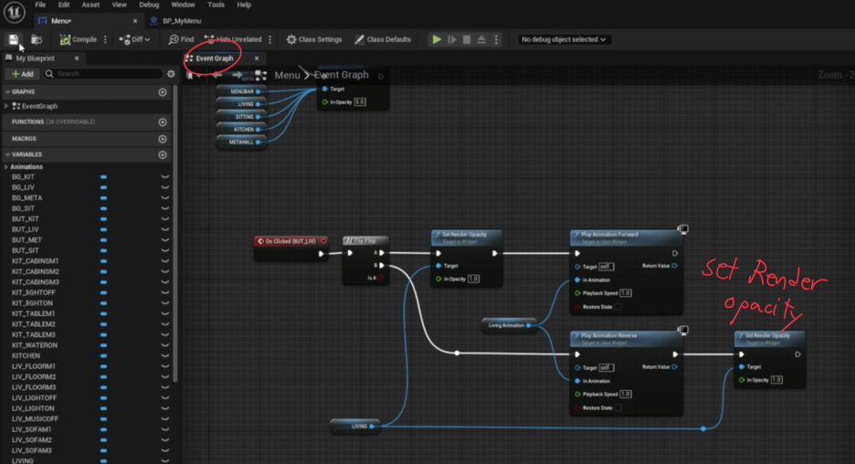 - 하위 메뉴 숨기기 추가: 메뉴가 닫힐 때 (Play Animation Reverse 실행 시), 모든 하위 메뉴(Living, Sitting 등)에 대한 Set Render Opacity 노드를 가져와 불투명도를 0으로 설정하여 모두 숨겨지도록 합니다.