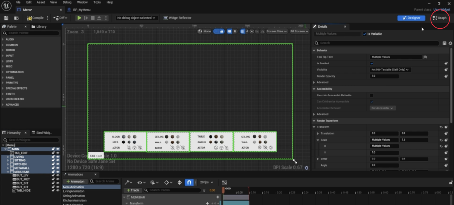 - Play Animation Forward가 실행될 때, Menu Bar에 대한 Set Render Opacity를 가져와 불투명도를 1로 설정합니다 (메뉴 표시).