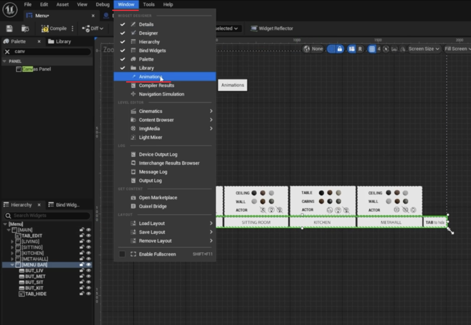 - 다른 버튼으로 복사: 이 로직을 Sitting, Kitchen, Meta Hall 버튼에도 복사하고 해당 하위 메뉴 캔버스 및 애니메이션 변수로 대체하여 모든 하위 메뉴에 대해 동일하게 작동하도록 합니다.
