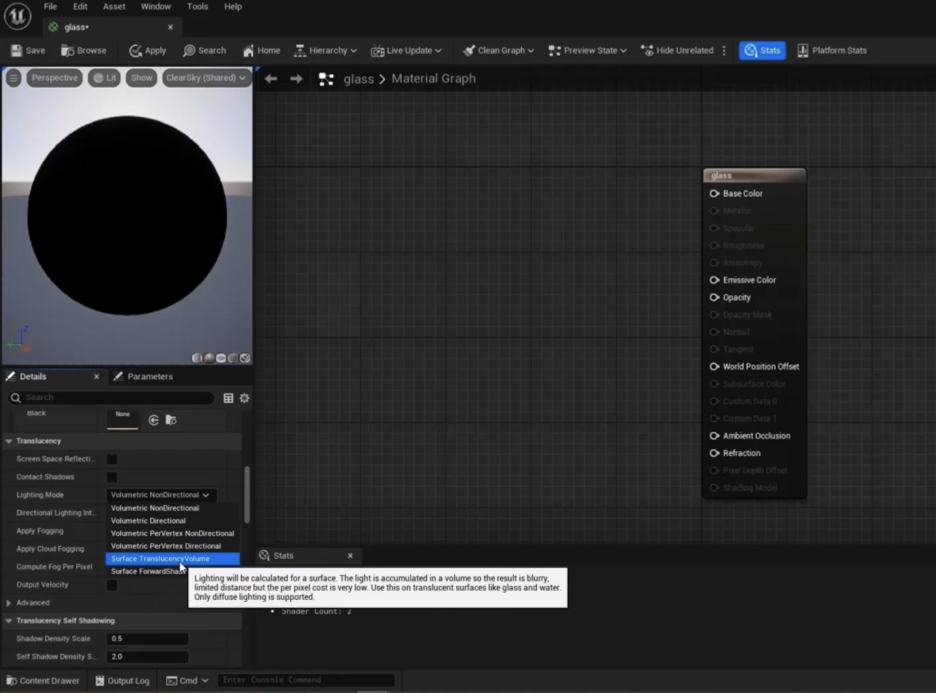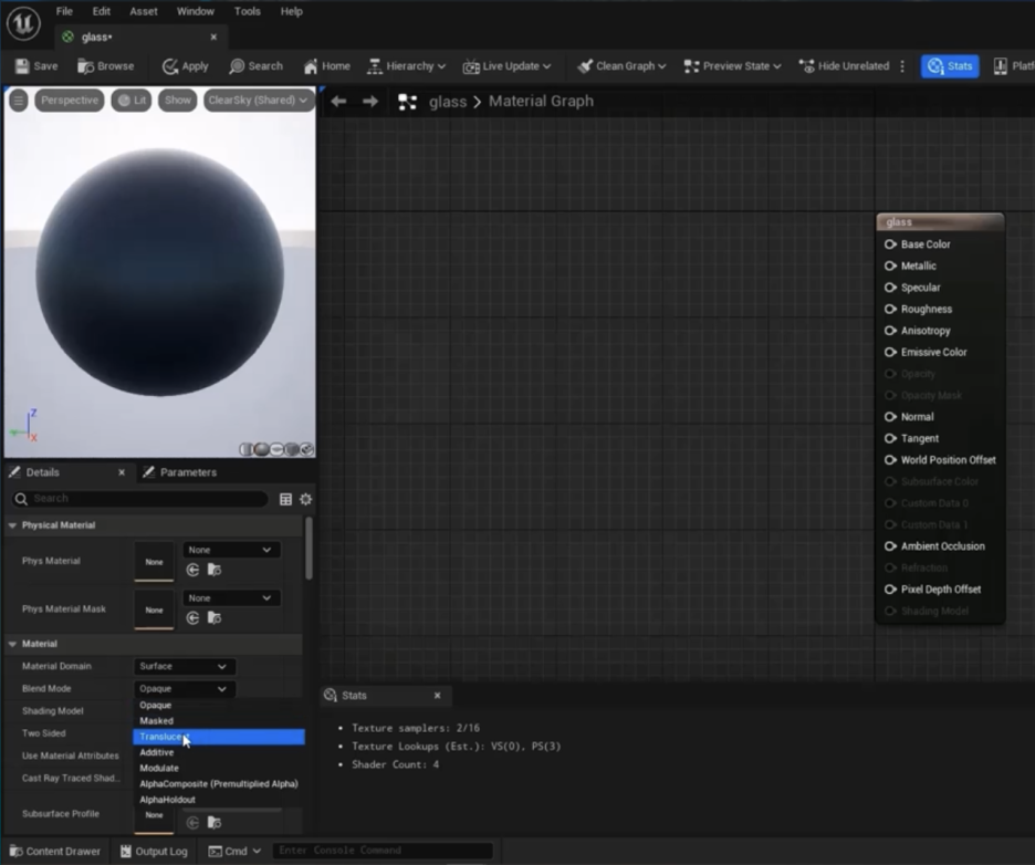 유리 재질을 만들려면 먼저 머티리얼 설정에서 **블렌드 모드(Blend Mode)**와 **조명 모드(Lighting Mode)**를 변경해야 합니다.
