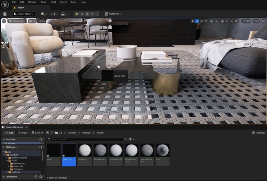 유리나 거울 같은 재질은 주변 환경을 사실적으로 반사하는 것이 중요합니다. Unreal Engine에서 이를 구현하려면 Planner Reflection을 사용합니다.