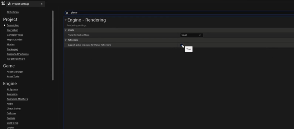 - Project Settings에서 'Planner Reflections' 옵션이 활성화되어 있는지 확인합니다. 만약 비활성화되어 있다면, 체크 후 에디터를 재시작해야 합니다.