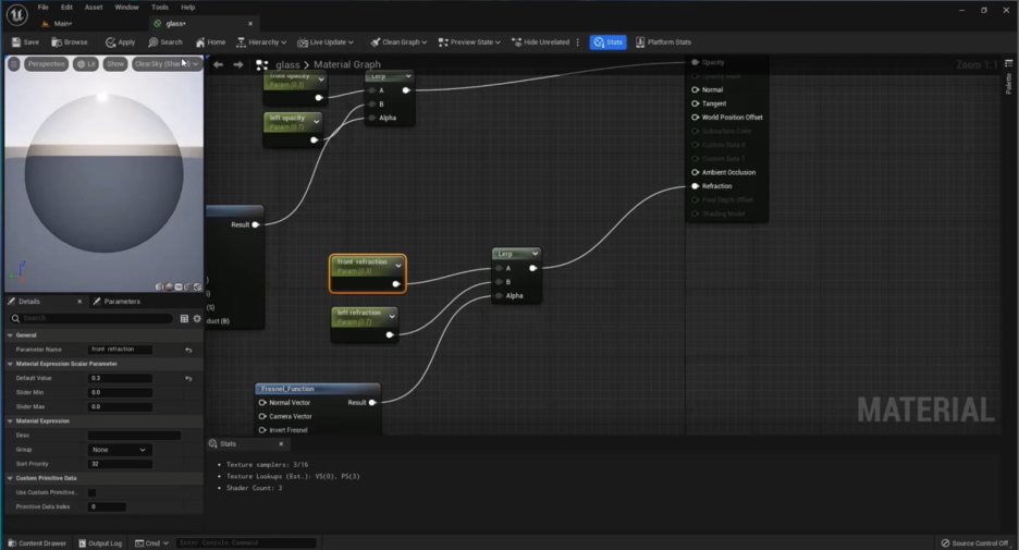 이번 글에서는 Unreal Engine에서 유리(Glass) 재질을 만드는 방법에 대해 중점적으로 다룹니다. 특히 Opactiy, Fresnel, Roughness, Refraction 등의 핵심 속성을 조정하는 법을 배웁니다.