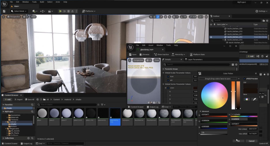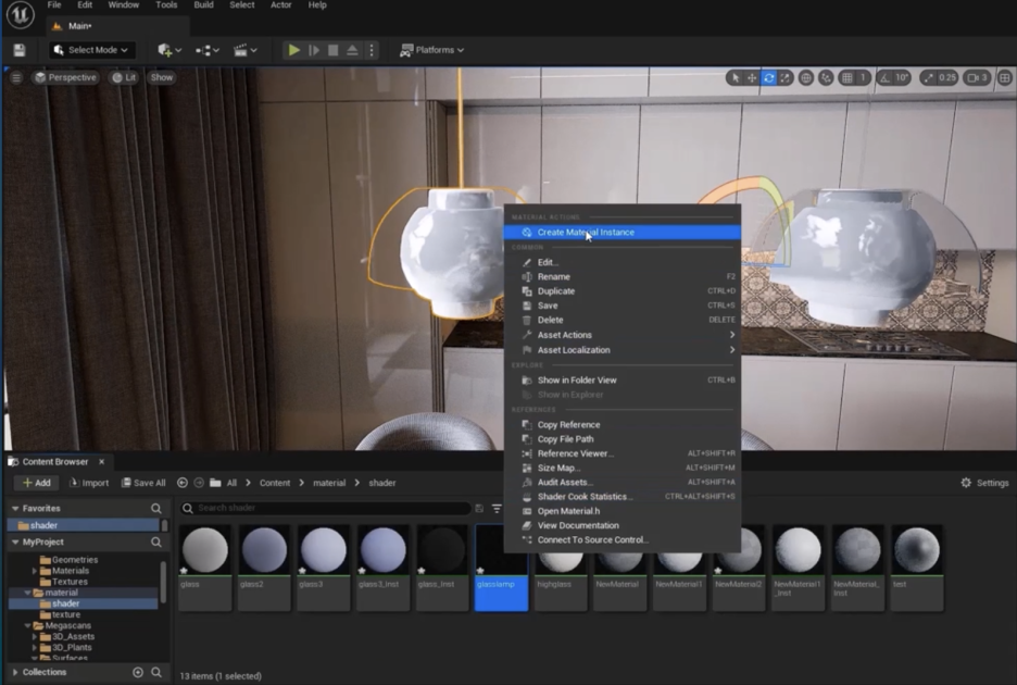 다음으로, 강사는 펜던트 조명(hanging lights)의 유리에 대한 새로운 재질을 만듭니다.