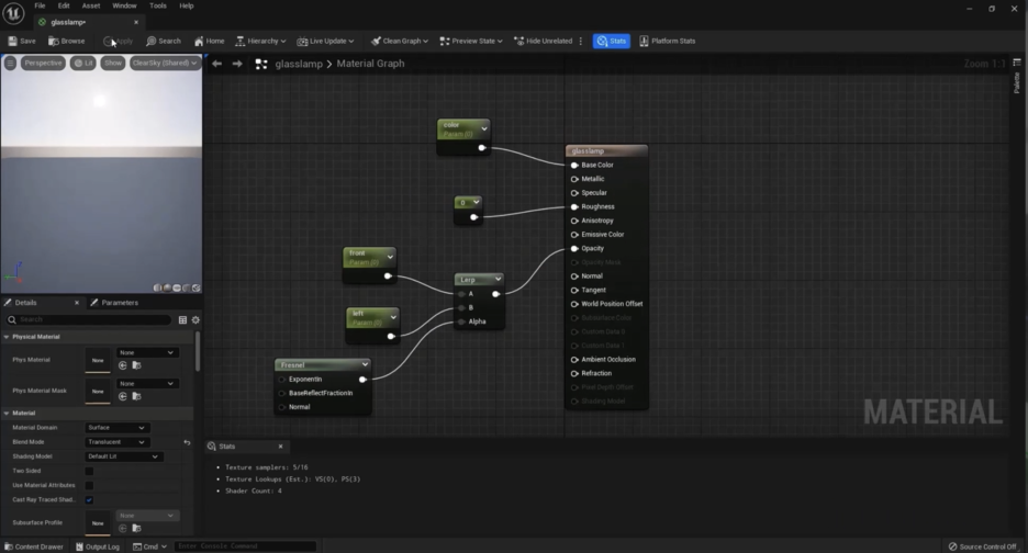 • 프레넬(Fresnel) 노드를 **알파(Alpha)**에 연결하여 빛이 보는 각도에 따라 다르게 반사되도록 합니다.