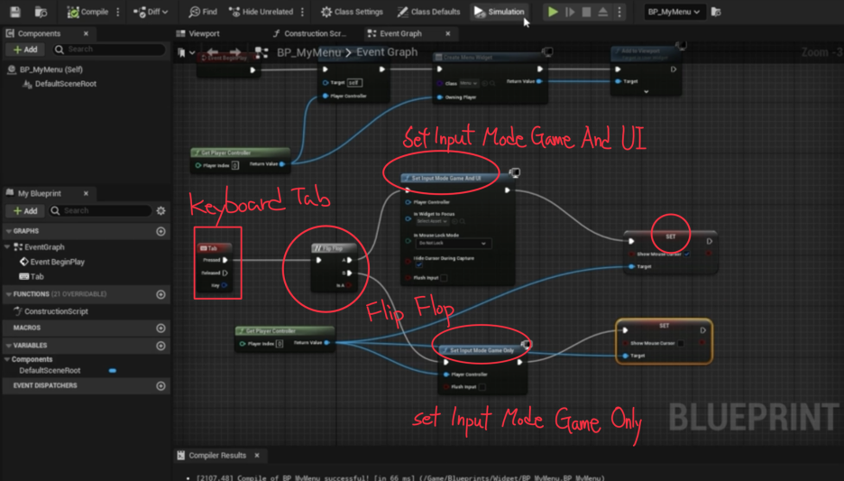1. 메뉴 시스템: 캐릭터를 조작하는 동안 P 키를 눌러 일시 정지 메뉴를 띄우고, 메뉴 블루프린트가 입력을 처리하도록 할 때 사용합니다.