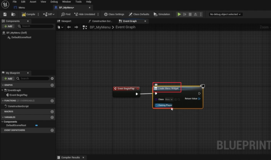 - Return Value 핀을 드래그하여 Add to Viewport 노드를 실행해야 합니다. 이 노드가 위젯을 최종적으로 게임 화면에 띄우는 역할을 합니다.