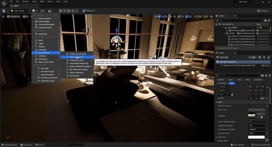 • 실시간 캡처(Real-time capture) 옵션을 사용하려면 스카이 애트모스피어(Sky Atmosphere) 컴포넌트가 장면에 추가되어 있어야 합니다. 스카이 애트모스피어를 추가하면 동적인 하늘과 조명 효과를 얻을 수 있습니다.