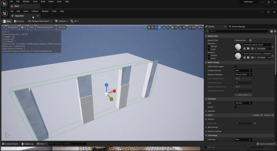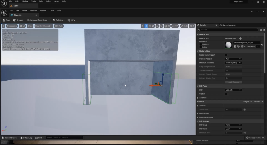 이 벽은 스태틱 메시로 가서, 이 경우에는 큰 **통합 충돌 상자(unified collision box)**가 우리에게 충분할 것입니다. 캐릭터가 창문을 통과할 수 없게 되어 있기 때문에 이것을 사용합니다. 그래서 기본적으로 우리는 벽의 각 부분에 대해 여러 개의 다른 충돌 상자를 만들 필요가 없습니다.