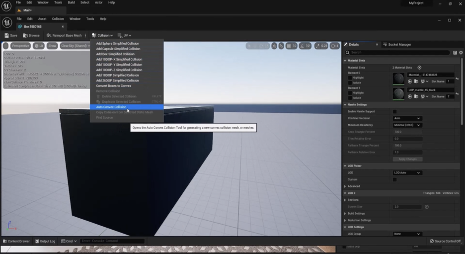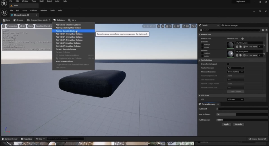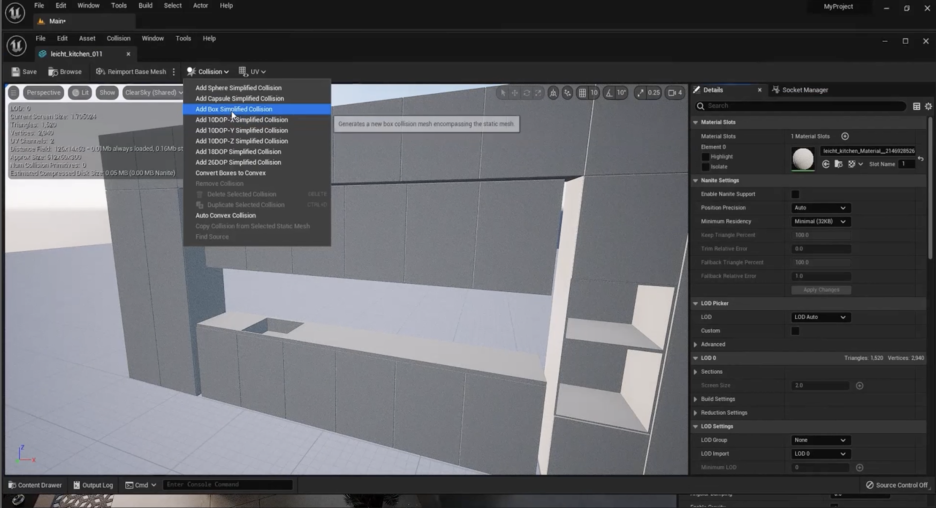 아래로 가보면 **주방 조리대(kitchen counter)**가 있습니다. 기본적으로 같습니다. 다시 스태틱 메시를 클릭합니다. 충돌을 위한 다른 옵션들도 있습니다. 구(Sphere), 그리고 **자동 볼록 충돌(Auto Convex Collision)**이 있습니다. 이것은 기본적으로 일부 복잡한 형상과 복잡한 물체에 사용됩니다. 일부 설정이 있지만, 기본적으로 물체의 미묘한 부분들을 처리합니다. 예를 들어, 이 작은 내부 공간처럼요. 하지만 우리는 이것에 대해 걱정할 필요가 없습니다. 그냥 이것을 제거하고 간단한 **상자 충돌(box collision)**을 추가하고 저장하면 됩니다.
