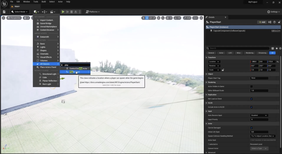 하지만 주요 문제는 **‘플레이어 시작’(Player Start)**이라는 것이 있다는 겁니다. 여기 있는 이 캡슐입니다. 조심스럽게 삭제할 수도 있지만, 설령 그렇게 했더라도 이 더하기 기호를 클릭하고 **‘모든 클래스’(All classes)**로 가서 실제로 **‘플레이어 시작’**을 검색한 다음, 건물 안에 원하는 곳에 놓을 수 있습니다.
