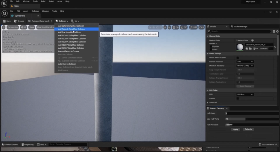 여기 이 기둥들이 있습니다. 우리는 다른 종류의 충돌을 사용할 것입니다. **캡슐(Capsule)**을 사용할 것입니다. 이것에 대해 **‘캡슐 추가’(Add Capsule)**를 사용합니다. 기본적으로 이것은 **원통(cylinder)**입니다. 그리고 그 기둥을 자동으로 캡슐화합니다. 우리는 아무것도 할 필요가 없고, 아무것도 선택할 필요가 없습니다. 그냥 저장합니다. 그리고 우리는 오른쪽에 있는 다른 것과 똑같이 합니다. 좋아요. 그래서 충돌을 위해 **‘캡슐 추가’**를 사용하고, 저장하고 돌아갑니다.