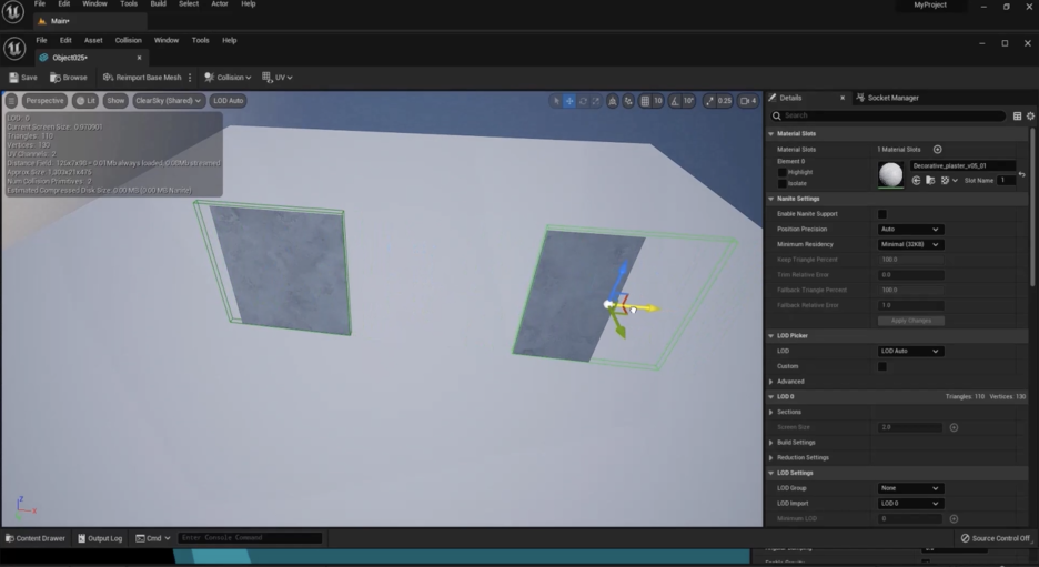 제가 가장 먼저 하는 일은 ‘창’(Windows) > ‘세부 정보’(Details) 창으로 가는 것입니다. 그리고 먼저 바닥을 선택하는 것으로 과정을 시작합니다. 그런 다음 **바닥의 스태틱 메시(Static Mesh)**로 이동하고 더블클릭합니다. 좋아요. 로딩될 때까지 기다리겠습니다. 아주 쉬워요. 얼마나 쉬운지 보게 될 거예요. 스태틱 메시를 더블클릭합니다. 이 창이 열리면, **‘충돌’(Collision)**을 클릭하고 **‘충돌 박스 추가’(Add Collision Box)**를 선택합니다. 즉, **‘단순화된 충돌(Simplified Collision) > 상자 추가(Add Box)’**입니다.