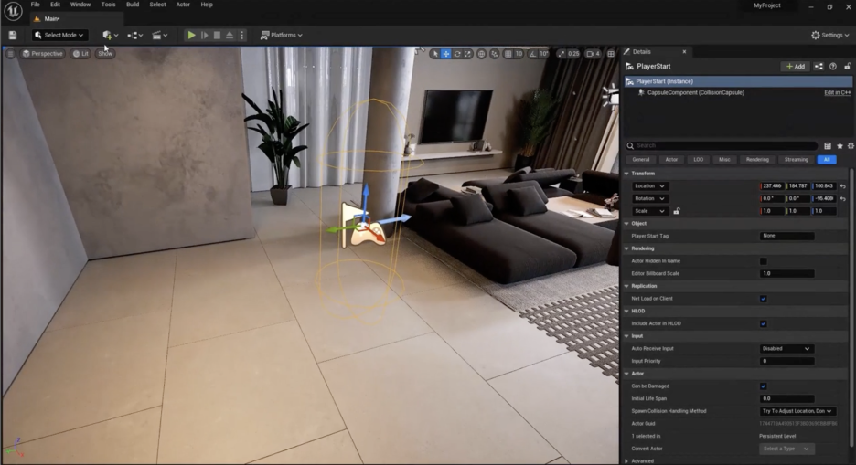 저는 이게 좋은 생각이라고 생각해요. 좋은 팁이에요. 이 캡슐은 고객이 프로젝트에서 시작할 장소입니다. 그래서 그들이 **‘플레이’**를 클릭하고 실행 파일을 시작하고 프로젝트에서 이동하기 시작하고 싶을 때, 그들이 시작하는 곳입니다. 그래서 저는 이것에 주의를 기울이라고 제안합니다. 이 캡슐에는 약간의 **치수(dimensions)**가 있습니다. 이 치수를 다른 세션에서 변경하는 방법을 설명해 드릴게요. 하지만 치수가 올바른 크기가 아니면 특정 영역을 통과할 수 없습니다.