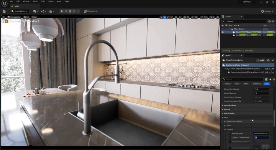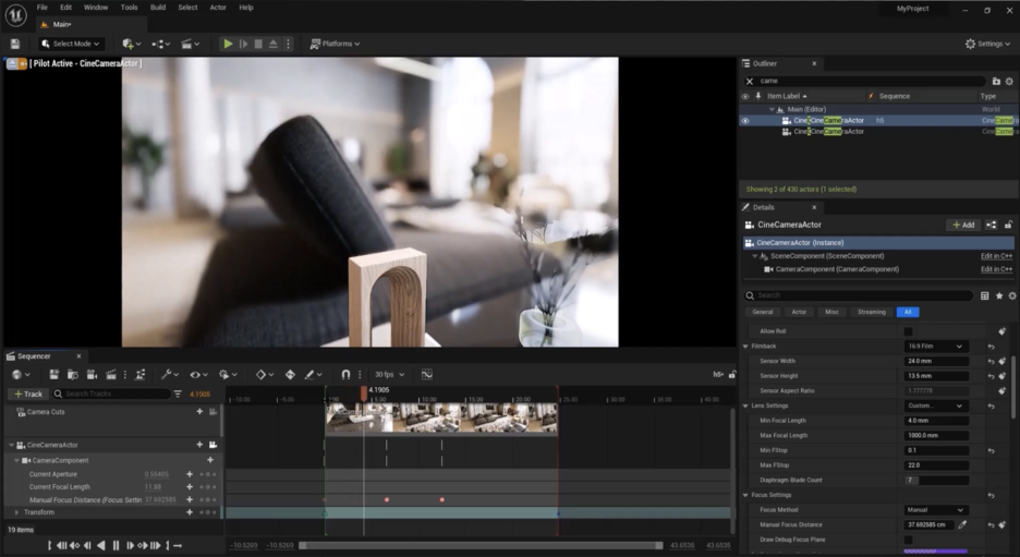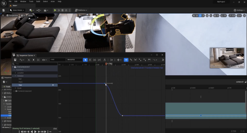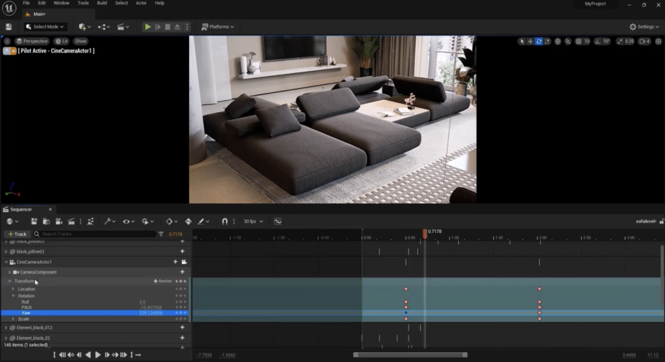 - 가구 애니메이션: 카메라 움직임에 맞춰 소파와 같은 가구들을 애니메이션화합니다. 오브젝트를 시퀀서에 추가하고, 키프레임을 사용하여 나타나거나 움직이는 효과를 만듭니다.