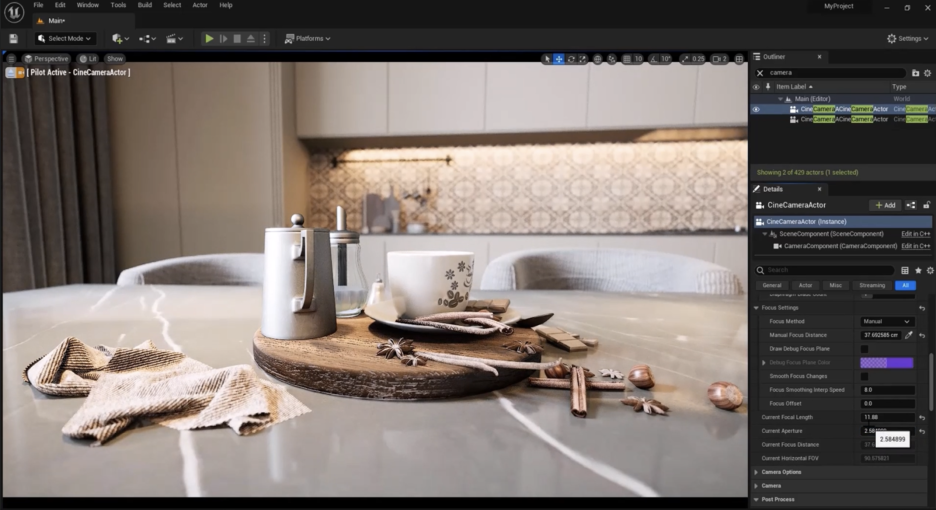 - 카메라 속성: 시퀀서에 추가된 카메라에는 Transform(변형), Aperture(조리개), Focal Length(초점 거리), Focus Distance(초점 거리)와 같은 속성들이 있습니다. 이 속성들을 시퀀서 내에서 직접 조절할 수 있습니다.