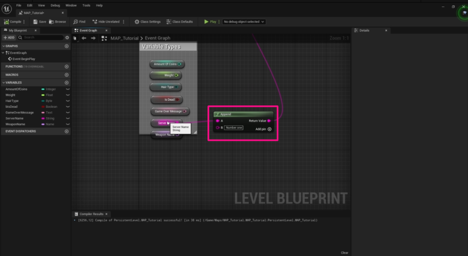 • 예를 들어, String 변수에서 선을 당겨 'Append (추가)' 노드를 사용하면 기존 텍스트에 더 많은 텍스트를 추가할 수 있습니다. (**"Mustafa's Server"**에 **"Number 1"**을 추가하여 **"Mustafa's Server Number 1"**을 만들 수 있습니다.)