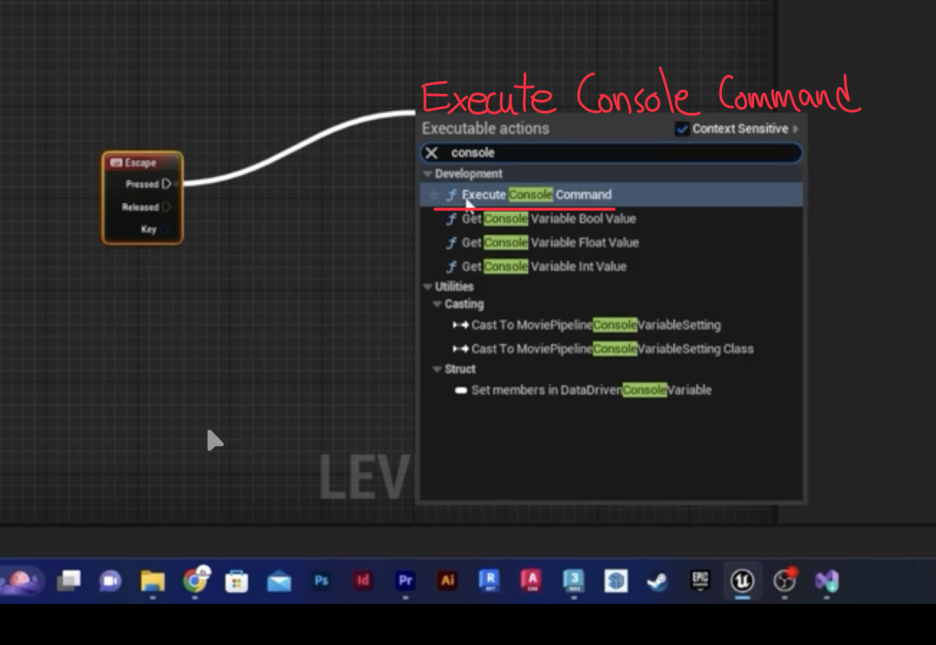 - **레벨 블루프린트(Level Blueprint)**를 열고 Keyboard Escape 노드에 Execute Console Command 노드를 연결하고, 명령으로 quit를 입력합니다.