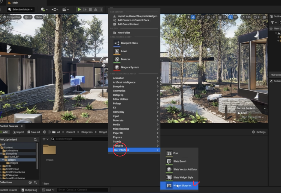 - 위젯 생성: 콘텐츠 브라우저에서 Add New → User Interface → **Widget Blueprint**를 선택하여 새 위젯 블루프린트를 만듭니다.
