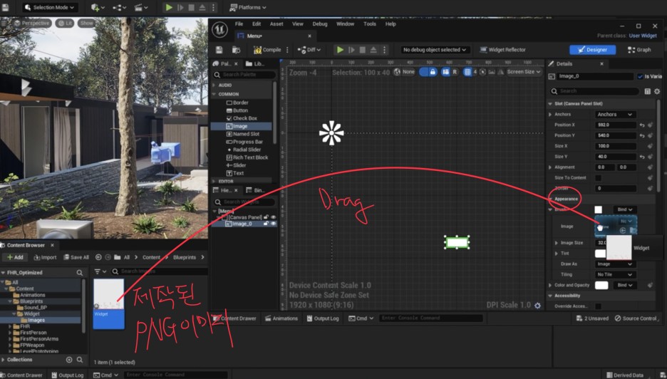 위젯 블루프린트에서 Image (이미지) 노드와 Button (버튼) 노드는 UI를 구성하는 가장 기본적인 요소입니다. 두 노드의 기능과 특징에 대해 설명해 드리겠습니다.
