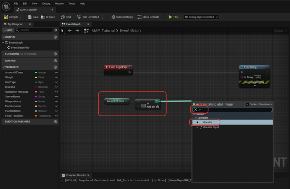 - 연산자 검색: 이 결과값(250)에서 핀을 당겨 'Greater Than (보다 큼)' 연산자를 검색하고 클릭합니다.